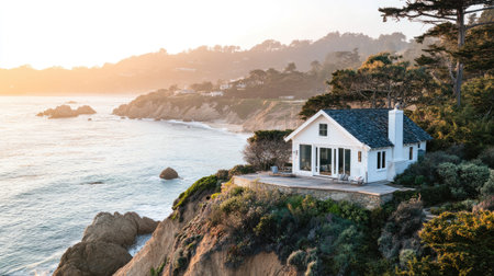 A charming coastal cottage perched on a cliff offers breathtaking views of the ocean at sunset. Ideal for retreats and vacations surrounded by nature.
