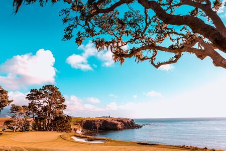 a serene pastoral scene captured in 8k resolution by michael shainblum. this hazy romanticism style photograph showcases a tree and grass on a cliff, overlooking the ocean. the light-filled landscape is bathed in a beautiful combination of light amber and teal, creating a captivating and bucolic atmosphere. ai generated