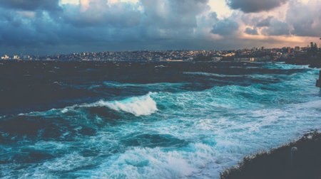 A dramatic view of a rough sea with large turquoise waves and white foam. A dark, cloudy sky looms over the distant city skyline, creating a moody and powerful atmosphere.