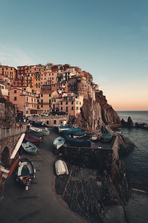 Manarola overlook Mediterranean Sea with buildings over cliff in Cinque Terre, Italy.