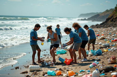 Volunteers working together to clean up plastic pollution on the beach as part of an environmental conservation initiative