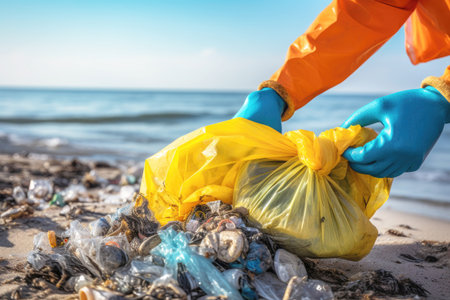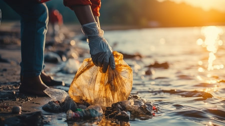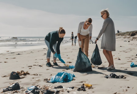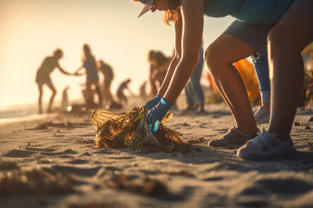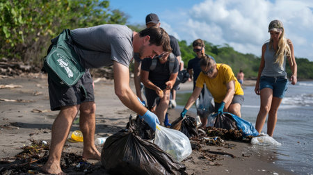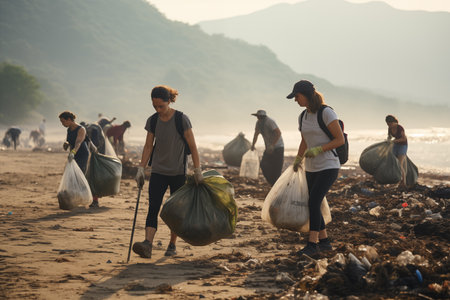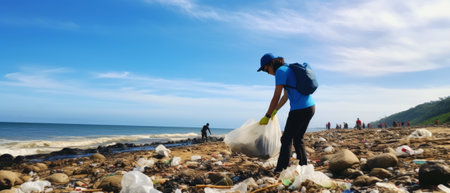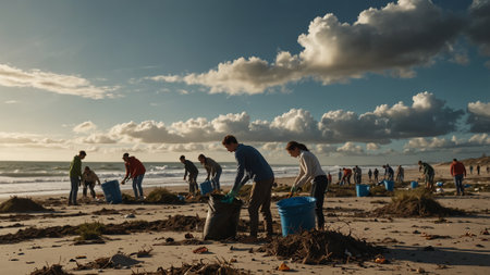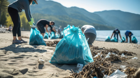 Volunteers gather on the beach, cleaning up plastic and waste to protect marine life and preserve nature. Generative AI