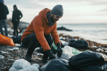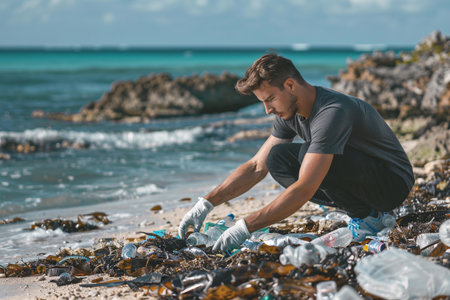 Man volunteer participating in coastal cleanup removing plastic debris from shore. Generative AI