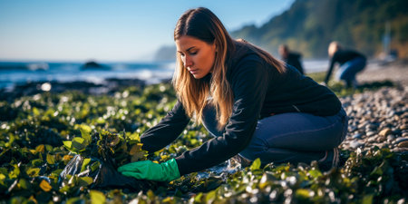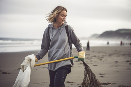 Volunteer Cleaning up a Beautiful Beach. Environmental Stewardship