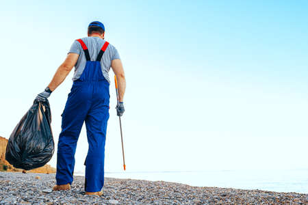 A man volunteer collects garbage on a dirty beach. The concept of waste recycling, environmental cleaning.The concept of waste recycling, environmental cleaning