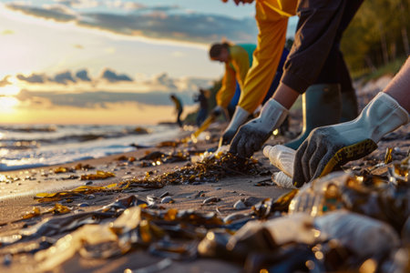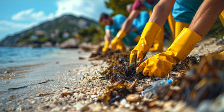 Close-up view of dedicated individuals removing litter from beach in diligent effort
