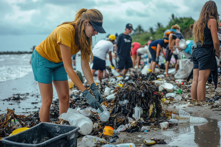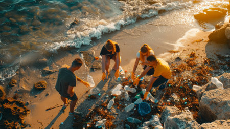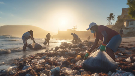 Volunteers cleaning up plastic waste from a polluted beach, showing efforts to combat environmental pollution Generative AI