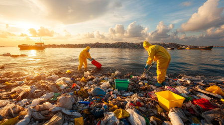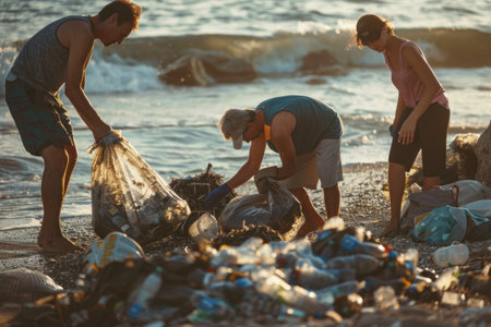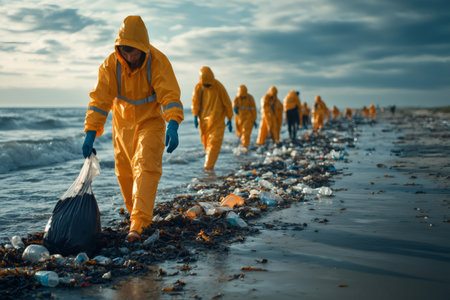 Garbage litters a sea beach, activists unite in passionate cleanup efforts dedicated to preserving marine ecosystems