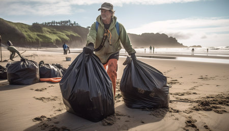 Volunteers collect trash and pollution from a beach after a storm. Ai generated.