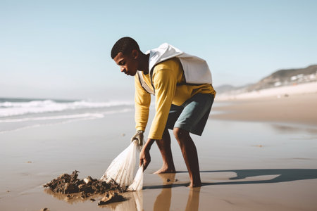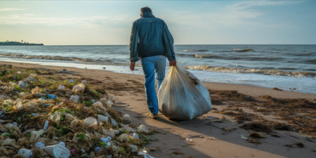 Man using his voluntary work in ecology to clean up trash on the beach.