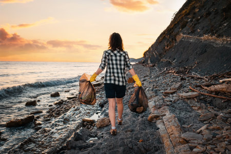 Woman activist walks along the wild coast and carries two bags of garbage. In the background, the ocean and the sunset. The concept of cleaning the beach from pollution.
