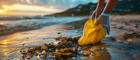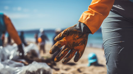 a banner showing a volunteer's gloved hands in close-up,in action during beach cleanup event, to protect marine life, ideal for environmental conservation campaigns and community engagement projects
