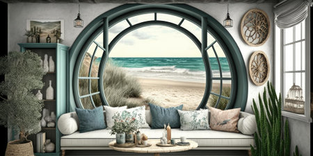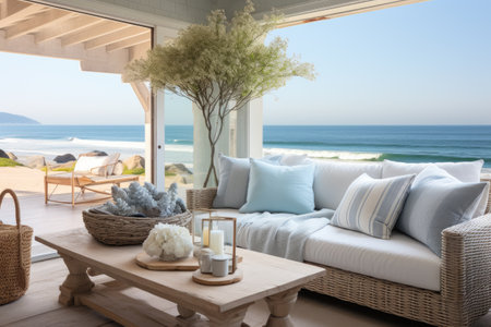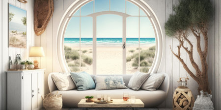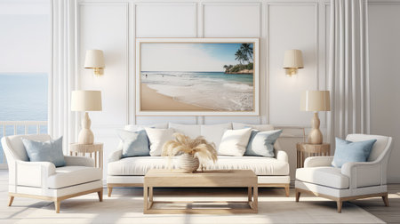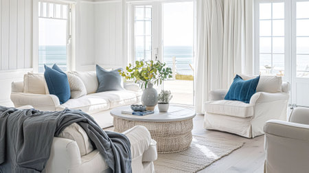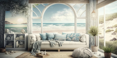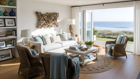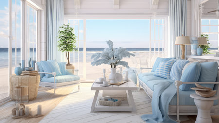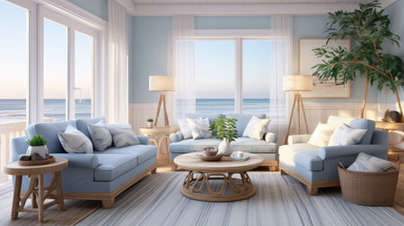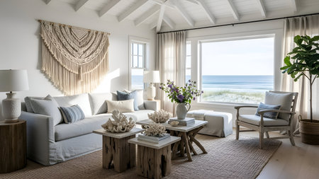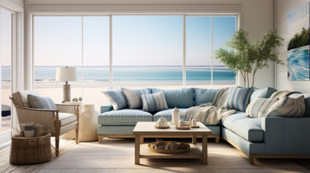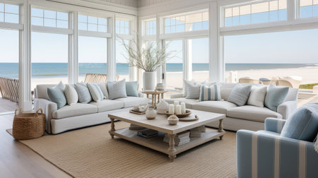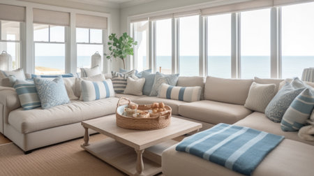 Coastal beach house living room with a breezy, nautical theme and coastal decor. Generative AI