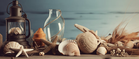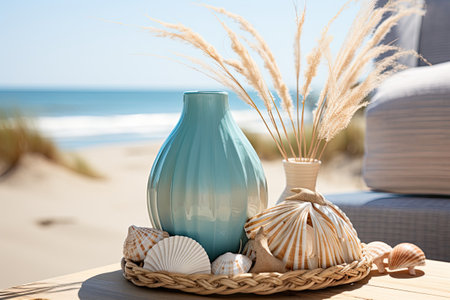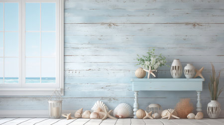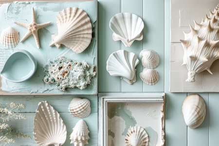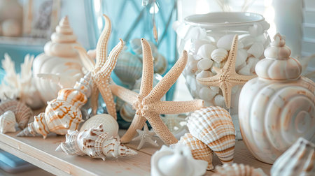 Beach-themed decorations with seashells, starfish, and coastal-inspired elements.