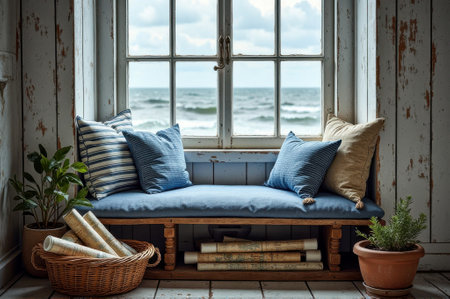 Inviting bay window seat features plush blue cushions and an array of throw pillows. A cozy blanket rests on the seat. Panoramic ocean view with clear blue sky and gentle waves creates serene coastal retreat, perfect for relaxation and enjoying natural beauty.