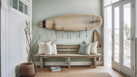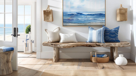 a serene entryway adorned with a driftwood bench, nautical artwork, and beachy accents, capturing the essence of seaside charm