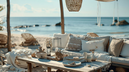 Beach house or hotel bungalow decoration in modern stylish boho. superlative generative AI image.