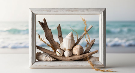 AI Generated. Seashells and Driftwood Frame with Foamy Ocean Water