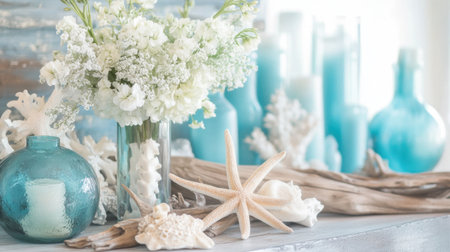 A beautiful arrangement featuring white flowers and natural elements like shells and driftwood set against soothing blue decor, evoking coastal charm.