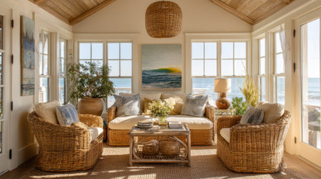 Natural textures fill this beachside cottage room: rattan armchairs, jute flooring, wicker ceiling fixture, and ocean art beneath sunlit panoramic windows.