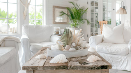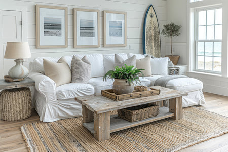 A bright and inviting living room decorated with beach-inspired elements, featuring natural materials and a relaxing ambiance.
