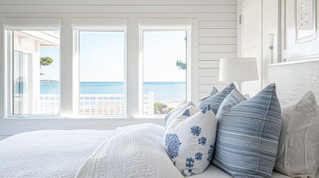Bedroom interior with coastal decor, white bedding and blue pillows, morning light streaming through window overlooking ocean view