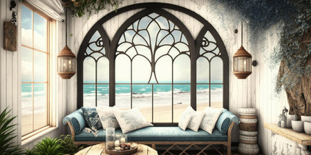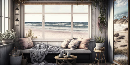 Coastal retreat interior with ocean view and rustic decor. That the image is generated using AI.