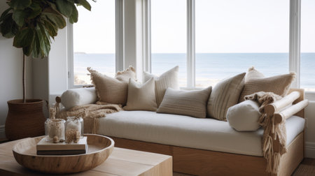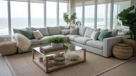 Interior design of Living Room in Coastal style with Ocean View decorated with Natural Fibers, Coastal Accents material. Coastal architecture. Generative AI AIG24.