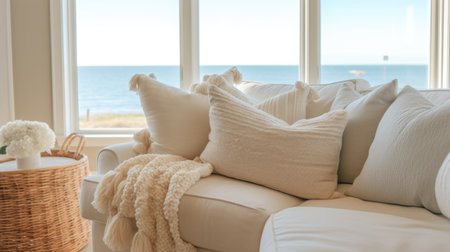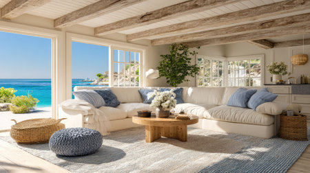 An inviting interior space features a plush white sofa adorned with blue cushions. Sunlight streams in through large windows, offering views of the ocean. The room showcases wooden beams, neutral tones, and decorative elements. This scene could be used for lifestyle, home decor, or real estate marketing materials.