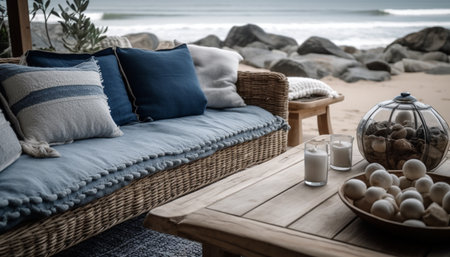 A cozy coastal living room featuring blue and white decor, a comfortable sofa adorned with pillows, and a wooden table. It evokes relaxation and style.