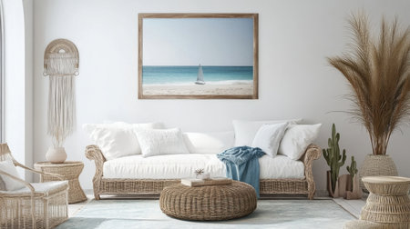 A serene living room featuring a cozy sofa, natural textures, and ocean view artwork. Ideal for creating a relaxing ambiance in any coastal home decor setting.