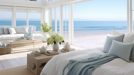 This bright beach house bedroom features soft bedding, a cozy atmosphere, and stunning ocean views, creating a perfect retreat for relaxation and tranquility.