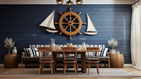 Nautical Escape: A coastal-themed living room with striped upholstery, weathered wood, and nautical accents. Generative AI