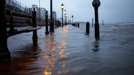 A flooded seaside boardwalk with lampposts and benches