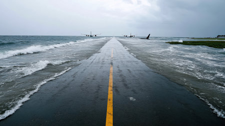 A flooded airport runway surrounded by seawater and aircraft