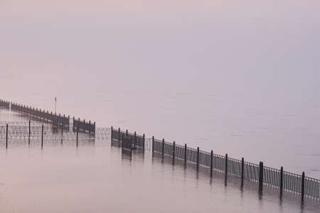 A metal fence of a flooded river embankment. Underwater promenade. Morning fog. A natural phenomenon. Bad visibility. Flooding in the summer of 2021 in the Far East. Blagoveshchensk, Russia.