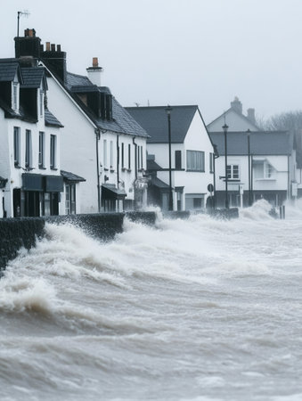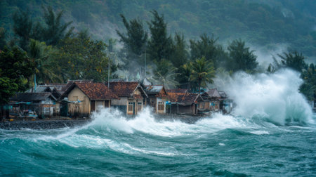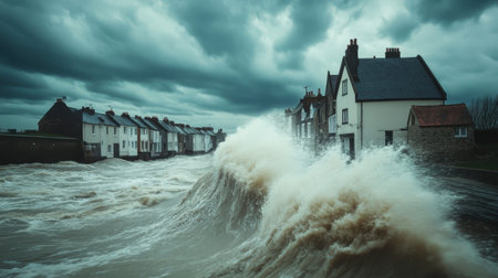Dramatic Coastal Storm Waves Crashing Against Houses Powerful Ocean Fury Winter Seascape grey cold