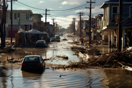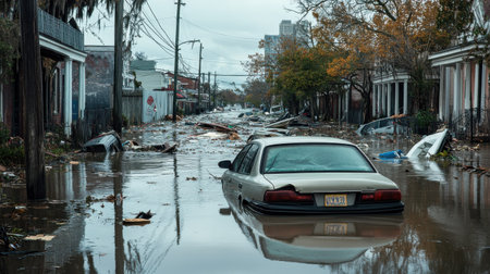 Streets in New Orleans are submerged in water post-hurricane, with cars floating and debris scattered across the road, creating a quiet yet eerie atmosphere.