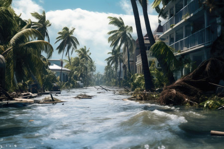 Flooded island streets. Heavy rains overflowing water impact. Generate ai