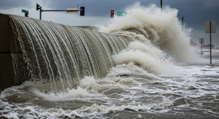 Dramatic Ocean Waves Crash Against City Buildings During Stormy Weather, Showcasing Power of Nature and Urban Environment Coexisting