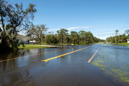 Flooded american street in Florida residential area. Hazardous driving conditions. Consequences of hurricane natural disaster