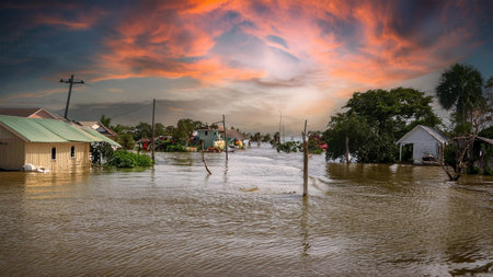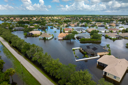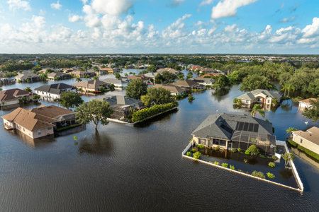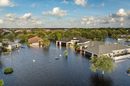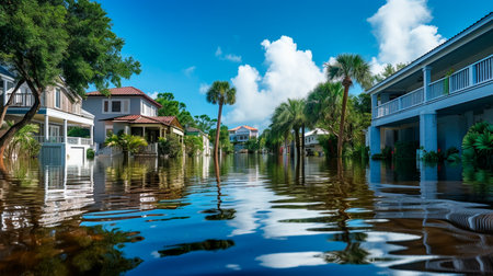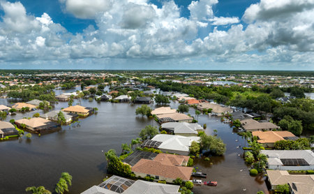 Tropical rainstorm flooded residential homes in suburban community in Florida. Hurricane aftermath