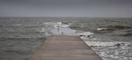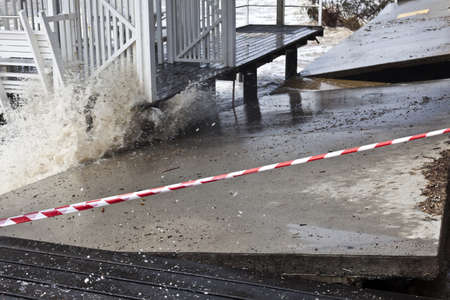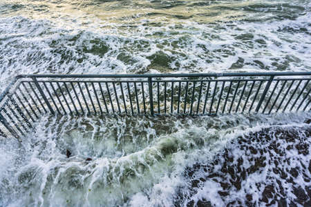 Stormy waves crashing on a dam in the city