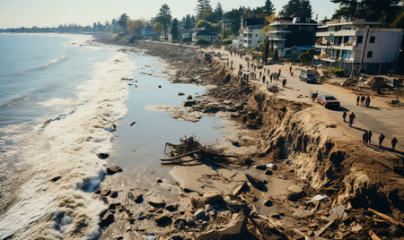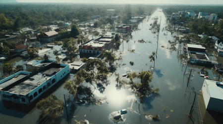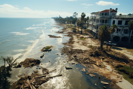 Hurricane Devastation: Aerial view of a coastal town in ruins after a powerful hurricane.Generated with AI
