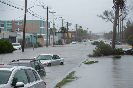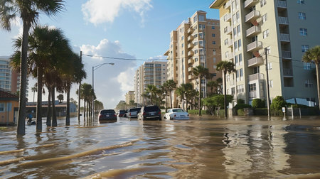Flooded american street with moving vehicles and surrounded with water houses in Florida residential area. Consequences of hurricane natural disaster