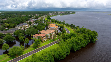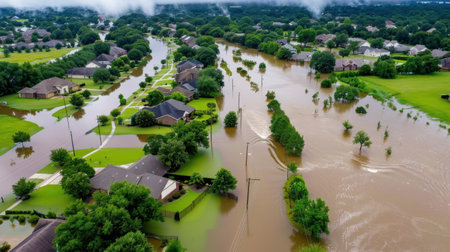 An aerial photograph capturing a suburban neighborhood submerged in water following recent flooding. The scenic view reveals the impact on homes, green areas, and infrastructure amidst overcast skies.