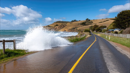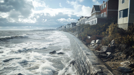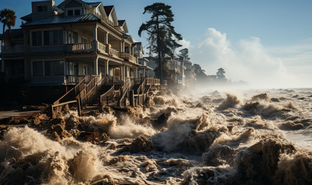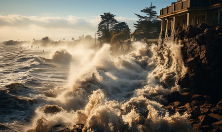 A powerful storm surge crashes against coastal homes, highlighting the dramatic forces of nature against a moody sky. The scene captures both beauty and destruction.