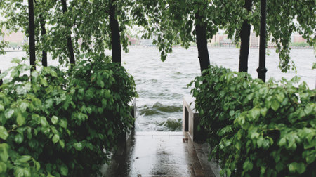 A wet, submerged walkway flanked by lush green bushes and trees leads directly into a high, overflowing river. The scene depicts flooding after heavy rainfall in a park.