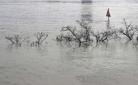 Flooded street n Budapest with traffic sign