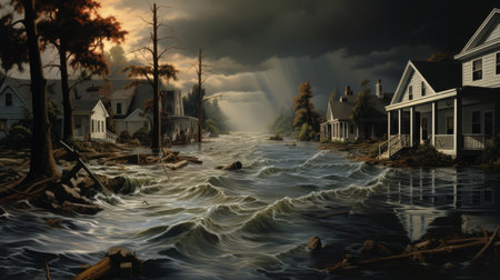 Generative AI Flood Insurance concept. impact of climate change. flooded streets of city look like stormy river. Consequences after heavy rainfall. Destroyed houses. Trees and logs washed away